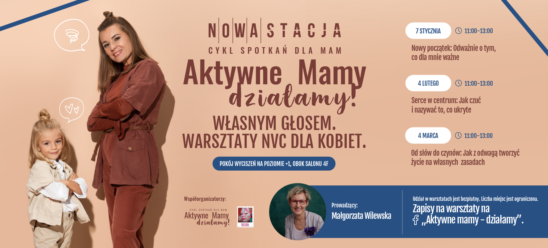 Małgorzata Wilewska – zajmuje się promocją w instytucji kultury, współtworzy Fundację Dbamy o Mamy oraz Dobre Warsztaty. Prowadzi spotkania oparte na Porozumieniu bez Przemocy (NVC), warsztaty kreatywne oraz autorskie empatyczne konwersacje w języku angielskim. W pracy z kobietami łączy kompetencje pedagoga i mediatora.
