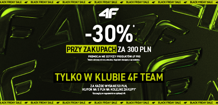 -30%* na wszystko przy zakupach za 300 PLN! Tylko w klubie 4F Team! Za każde wydane 50 PLN – kupon 5 PLN na kolejne zakupy*
