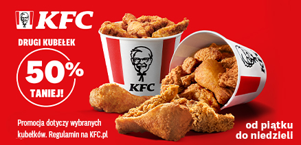 Teraz od piątku do niedzieli w KFC drugi kubełek 50% taniej! Promocja dotyczy wybranych Kubełków. Regulamin na stronie kfc.pl.